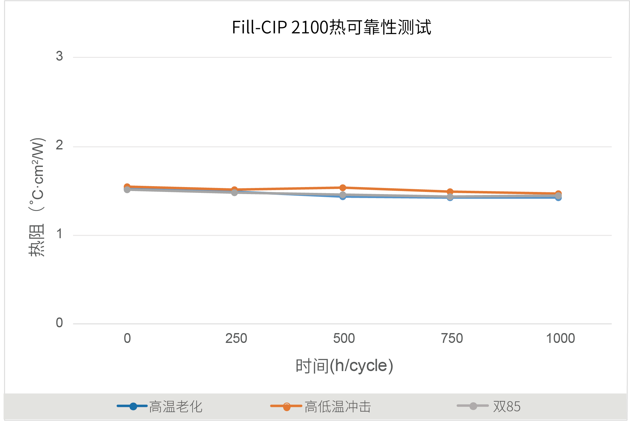 在1000小時150℃高溫老化測試、高低溫循環(-40℃~150℃)和85℃ 85%高溫高濕老化測試條件下,Fill-CIP 2100熱性能表現穩定,無導熱性能下降的跡象,體現出卓越的耐老化與極端環境適應能力。